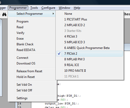 You should already have the PICkit 2 connected to your PC via the USB port, so after a successful build of our program, we can program the chip by selecting the ‘Programmer’ menu from within MPLAB, and then selecting ‘Select Programmer’, then ‘PICkit 2’.